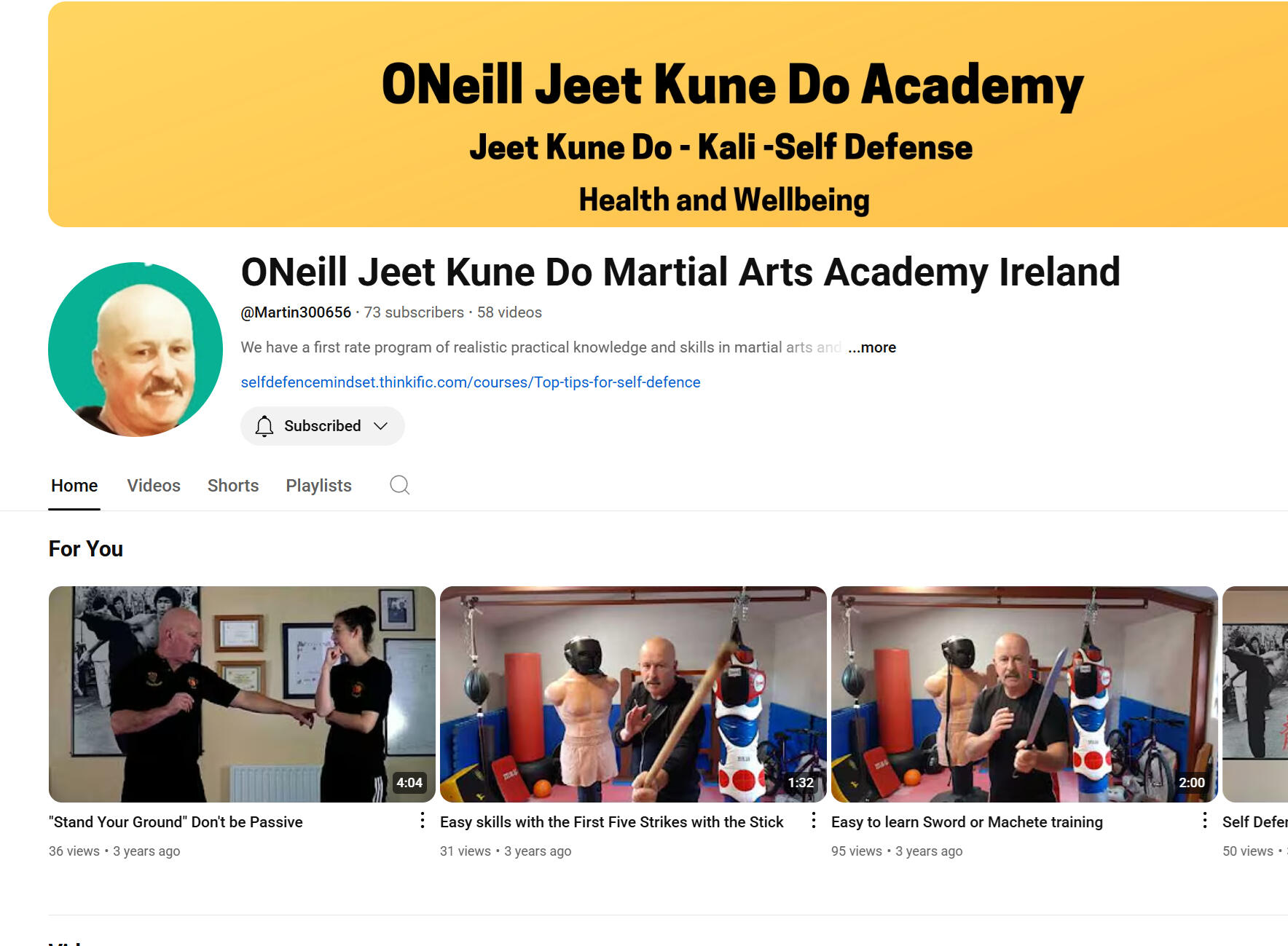 and Irish Stick Fighting (separate class).Martin O’Neill and his Instructor team Niall Hughes and David Park (both 5th degree black belts), Dude and Mark (senior students and apprentice instructors) cover a wide spectrum of topics, and there's always something interesting to learn regarding getting better self-confidence, knowledge, fitness, health, and well-being, and self-defence to keep you and your family safe.Instructor Martin O’Neill Msc, has over 40 years of experience and is a Certified Full Instructor. He is the Author of “The Jeet Kune Do Mindset” and “ Street Survival Essential Self Defence for the Streets” available on Amazon.You can learn quickly and revisit skills in classes or private lessons. We introduce you to many concepts and ideas you may not have had access to. We teach with genuine practical applications, humour, and a down-to-earth martial arts presentation. All are presented and accessible regardless of the complexity of the topic, each person makes progress at their own pace.Belt and Certification are available according to knowledge, interest, and skill. We present a non-competitive, yet challenging and welcoming space in which powerful truths are presented in ways that become good practice rather than the latest fad or fashion.The approach takes a life long learning approach and is not superficial, in-your-face, shouting at you about how to be tough, have the perfect body, be the envy of your friends, be the best or the greatest. It will feel accepting, welcoming, open, honest, kind, and challenging. You will develop your physical ability, your wellbeing and your view of yourself whilst engaging at training.